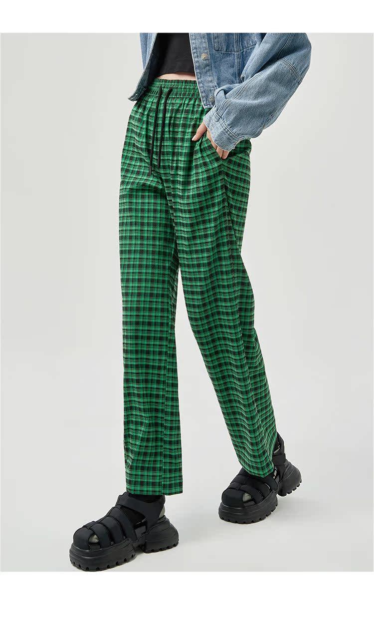 イージーウェアとしての機能性と緑のチェック柄の美しさを兼ね備えたズボンです。