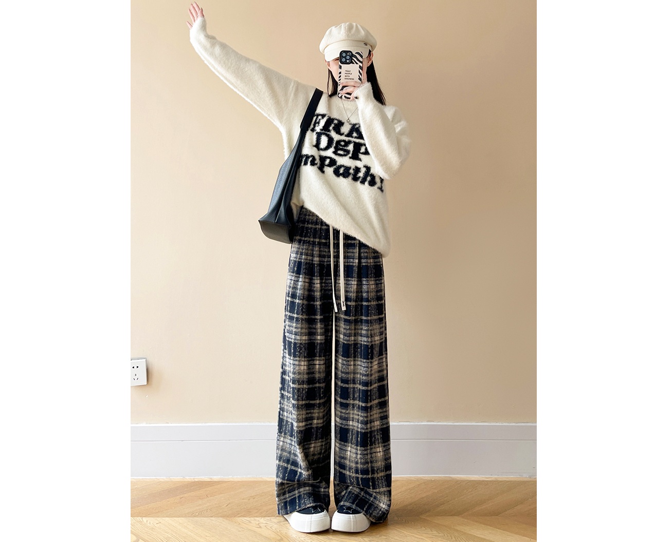 季節感あふれる格子柄のワイドパンツです。寒い季節にぴったりのあたたかな素材感と、足元まで広がるゆったりしたシルエットが特徴です。