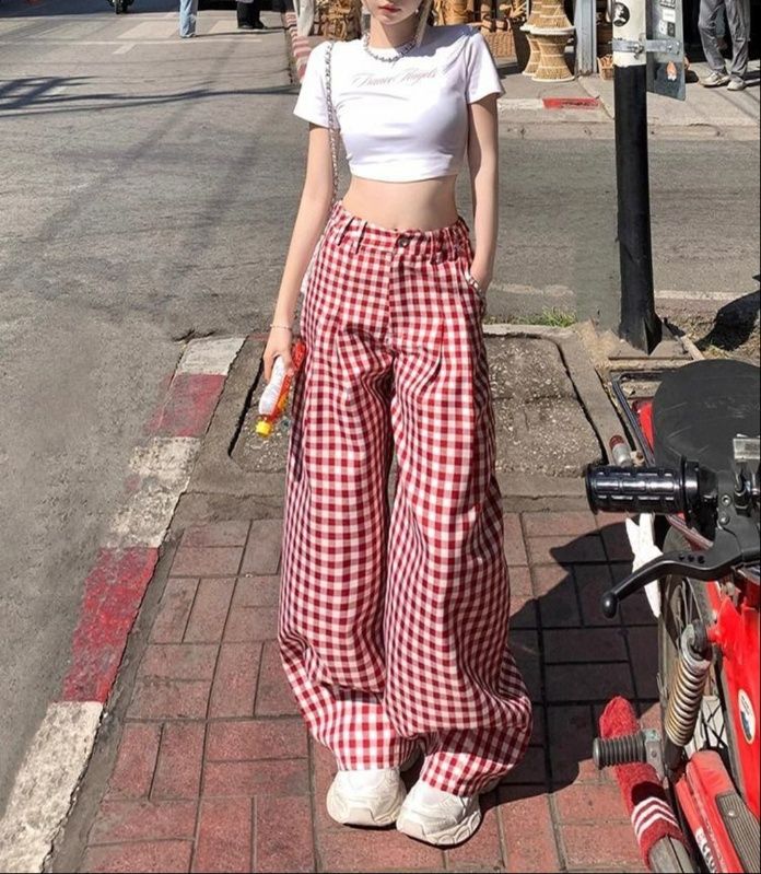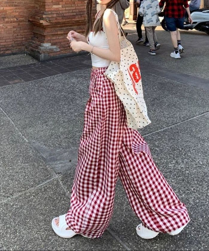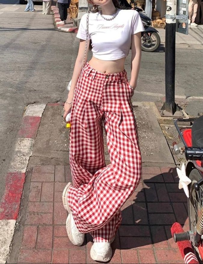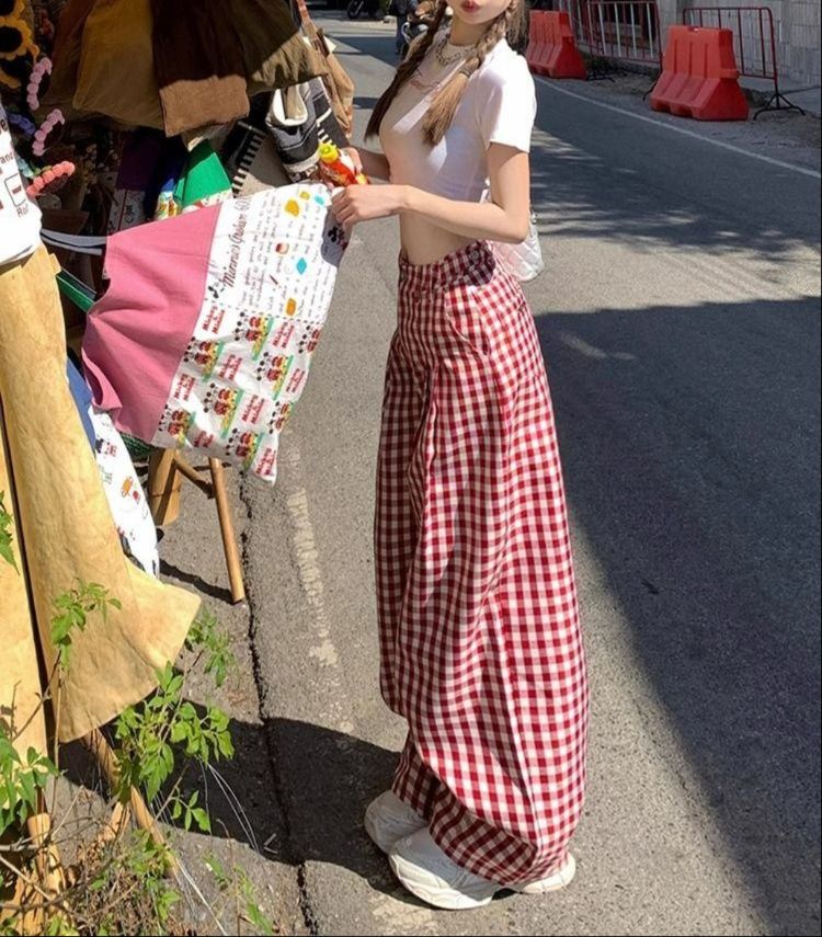 赤のギンガムチェックが爽やかで可愛らしい印象を与え、白のトップスと合わせることで明るく軽やかなコーディネートが完成します。